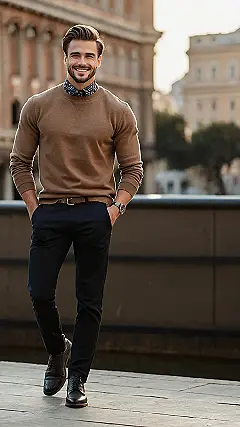 Hey there, fashion-forward ninth-graders! Check out this guy – he’s totally rocking the “mens smart casual outfits” look. It’s like the perfect blend of “I’m dressed up, but I also just want to hang out and maybe grab some pizza.” A comfy olive green sweater over a crisp white shirt? Genius! The dark pants and shoes add a bit of sophistication, without looking like he’s about to give a presentation to the United Nations. This is the kind of outfit that says, “I’m cool, confident, and ready for anything,” whether that’s a school dance or a casual Friday at work (when you’re all grown up, of course!).