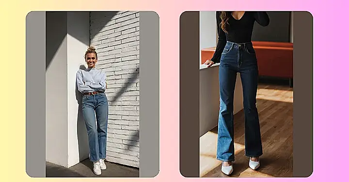 This picture shows off two awesome ways to rock straight fit jeans! See how a simple grey long-sleeved shirt can look super chic with a pair of perfectly fitting jeans? Whether you’re going for edgy with boots or fancy with heels, straight fit jeans are your best friend for a day out. They’re comfy, they’re stylish, and they go with practically anything – kind of like pizza, but way more fashionable.