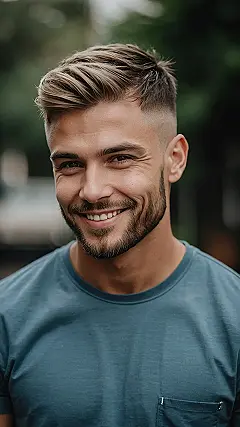 Alright, let’s talk about this fade haircut – it’s like the hair version of a perfect gradient! Notice how it goes from longer on top (where you can style it all cool and messy like this dude) to super short on the sides? That’s the fade, and it’s basically the superhero of haircuts because it makes anyone look instantly more put-together. Forget spending hours trying to make your hair cooperate – with this cut, you’re already halfway to winning best hair in the yearbook!