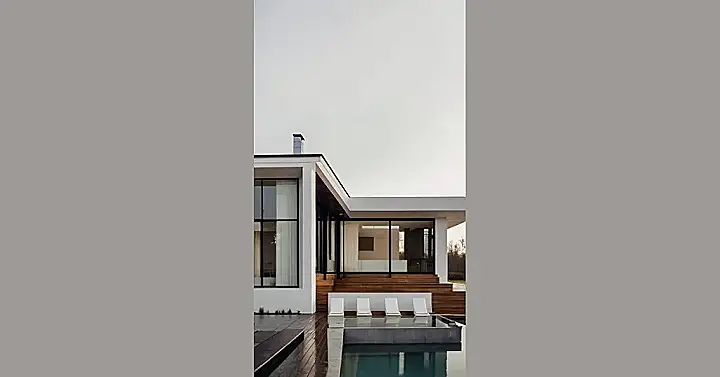 This house is seriously next-level cool. It’s got that sleek, modern look with all those windows – perfect for spying on your neighbors, or just enjoying the view without actually having to go outside. And that outdoor table and chairs? Ideal for pretending you’re super sophisticated while really just eating pizza with your friends. Who needs a boring old mansion when you can have this stylish, chill spot?