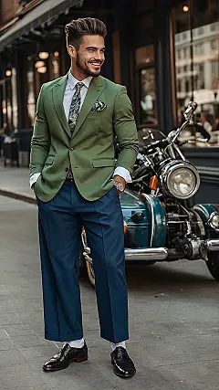 But seriously, check out the details! That bright green jacket isn’t your usual boring color, and paired with those deep blue pants? It’s a winning combo that looks both classic and ready for anything, even if ‘anything’ is just posing with his sweet ride. It’s like he mixed fancy Sunday best with rugged road trip vibes. He’s proving that Americana style isn’t just about jeans and boots; sometimes it’s about looking incredibly put-together while hanging out with a machine that probably smells like old gasoline and adventure. He’s basically saying you can look fly no matter what you’re doing, even if your ride has seen better days.