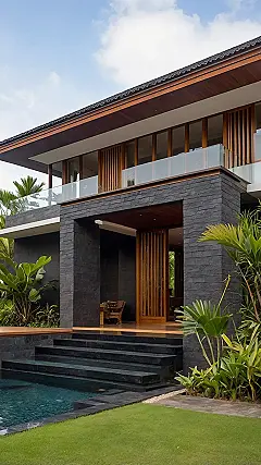 This modern tropical house is seriously cool, like it jumped right out of a travel magazine but forgot to pack the tiny umbrellas for drinks. It’s got this dark stone look that makes it seem super sleek and maybe a little mysterious, like it’s hiding secret passages (probably just storage closets, but hey, a kid can dream). And those steps going right into the pool? That’s peak relaxation design. Who needs a diving board when you can just smoothly walk into the water after a long day of, you know, chilling?