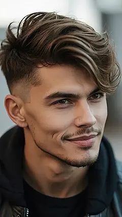 Alright, let’s talk about this fade haircut – it’s like the hair version of a perfect gradient! Notice how it goes from longer on top (where you can style it all cool and messy like this dude) to super short on the sides? That’s the fade, and it’s basically the superhero of haircuts because it makes anyone look instantly more put-together. Forget spending hours trying to make your hair cooperate – with this cut, you’re already halfway to winning best hair in the yearbook!
