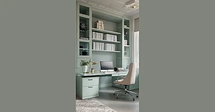 This office is like a breath of fresh air! It’s got this super calming mint green color that’s way less boring than a plain white office. You can tell the person who designed it wanted it to be super organized because there’s a ton of shelves for all their books and stuff. Plus, the desk has a little drawer for keeping all the secrets from the school drama!