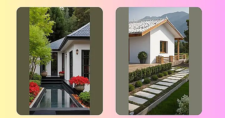 This house looks so chill, it’s like it’s asking you to take a deep breath and forget about all your worries before even stepping inside! I mean, just look at that walkway. It’s like a giant stress-relieving puzzle for your feet! You could almost imagine yourself gliding along it in slow motion while listening to spa music. I bet even arguing siblings would magically be nice to each other just to maintain the peaceful vibes.