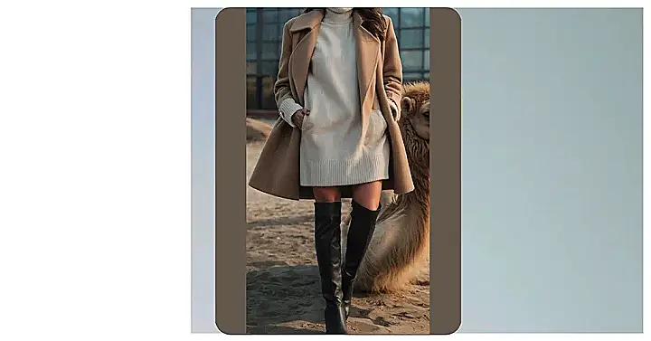 This outfit is seriously chic! Imagine strutting your stuff in a gorgeous camel-colored coat, a comfy cream sweater dress, and some seriously stylish black boots. It’s the perfect blend of warm and cool, and you’d look like you stepped straight out of a fashion magazine. Plus, the unexpected bonus of a friendly camel hanging out in the background just adds to the overall fabulousness! It’s like, even camels approve of this look.