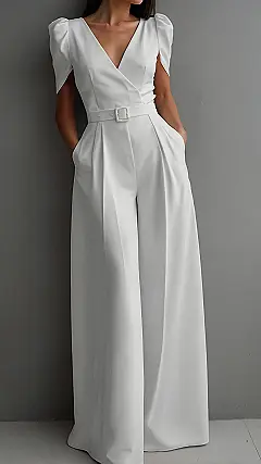 This white jumpsuit situation is basically the outfit version of saying, “Yep, I woke up like this… and decided to look totally fabulous.” Check out those wide legs – you could probably stride into a room and feel like a movie star just by wearing this. It’s got that fancy crossover top and a belt that screams “I have my life together,” even if you’re currently stressing about your next homework assignment. Wearing something this effortlessly classy makes you walk a little taller, just be careful not to trip over your own awesomeness (or the extra-wide pant legs!).