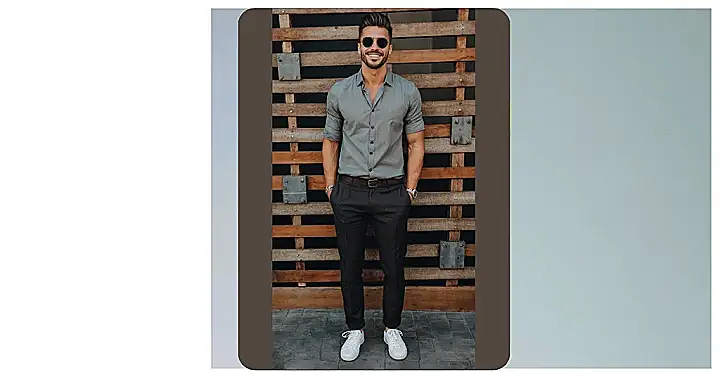 Check out this dude! He’s rocking a simple shirt, slick trousers, and clean white sneakers. It’s the kind of look that says, “Yeah, I put zero effort into looking amazing.” Except, you know, he totally did. But seriously, it’s smart, it’s casual, and it looks super comfy. Plus, that little ankle roll on the pants and the cool shades? Chef’s kiss! It just proves you don’t need wild colours or crazy patterns to stand out and look put-together, even if you’re just leaning against a wall looking cool.