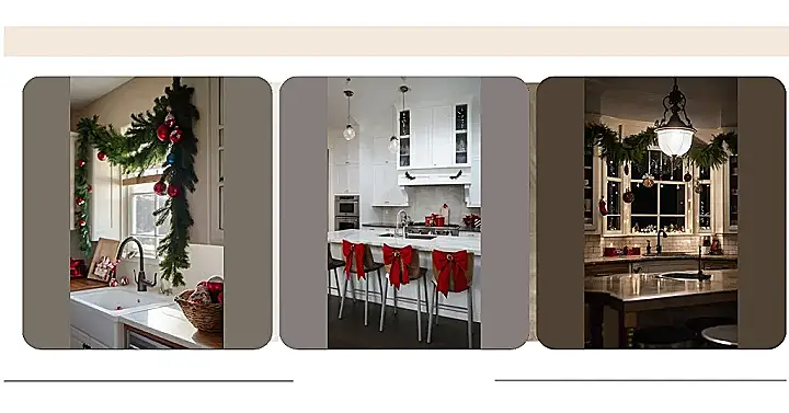 This Christmas kitchen is totally rocking the festive spirit! Look at those gorgeous red bows tied to the kitchen chairs—it’s like Santa’s elves got a hold of some serious crafting supplies. Those bows add a touch of holiday cheer without going overboard. The whole kitchen feels warm and inviting, perfect for baking cookies and sipping hot cocoa while dreaming of presents under the tree! It’s proof that even the smallest decorations can make a big difference, especially when they’re as stylish as these.