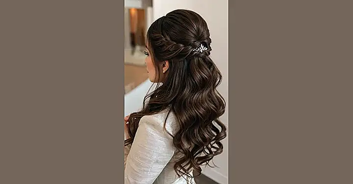 This hairstyle is like a fairytale come true! Imagine getting ready for your big day, feeling like a princess with gorgeous, bouncy curls cascading down your back. Half of your hair is elegantly swept up, perfectly showcasing that dazzling sparkly hairpiece – it’s like a mini constellation of awesome! It’s the perfect blend of sophistication and fun, so you can dance the night away without a single hair out of place (well, maybe a few playful curls!).