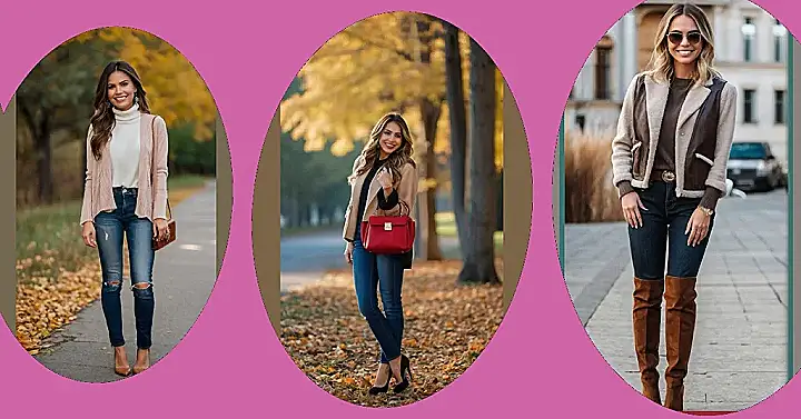 This outfit is perfect for a casual dinner date this fall. Imagine the crisp autumn air, the smell of cinnamon, and the warm glow of the restaurant as you walk in, looking absolutely fabulous! The jeans and sweater are comfy but stylish, and the jacket adds a touch of sophistication. Plus, that bright red bag really pops against the fall foliage. You’ll be the envy of everyone at the table!
