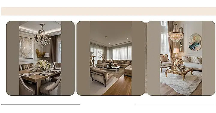 The whole place is just dripping with elegance! From the shimmery, stylish coffee table to the fancy curtains, every detail is so perfectly chosen. It’s the kind of room where you could totally picture yourself sipping hot cocoa while wearing a fluffy robe and watching your favourite show. Plus, that chandelier? It’s practically begging you to take a selfie underneath it. It’s not just a room; it’s an experience. A seriously sparkly, luxurious experience.