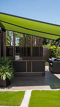 Isn’t this canopy design just screaming “chill vibes”? I’m imagining myself in that chair, sipping a cold drink, totally escaping my math homework under that cool, slatted roof. It looks like the perfect spot for sneaking in some extra phone time while pretending to “enjoy nature.” The straight lines and tidy setup really give off a modern, sophisticated feel, almost like a secret hideout for the super cool and slightly lazy.