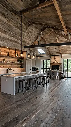 Picture this: you walk into your very own small barndominium, and BAM! The ceiling is so high, you could probably practice your basketball shots indoors (maybe don’t try that). It’s got that cool barn vibe with the metal roof inside, but it’s all cozy home, no dusty hay. This place is like the superhero of small spaces, looking huge and awesome with that massive island table perfect for epic pizza nights or just spreading out your homework (okay, maybe mostly pizza).