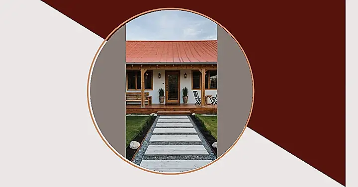 Forget those giant houses that look like castles! Check out this sweet little barndominium – it’s like a cool barn decided it wanted to be a house instead of holding hay. See that bright red roof? It probably sounds awesome when it rains, like nature’s drum solo. And the porch is perfect for chilling, maybe sipping some lemonade while pretending you own a vast ranch, even if your ‘ranch’ is just the backyard. This place proves small can be super stylish, especially with those cool wooden posts and the welcoming pathway leading right up to the door.