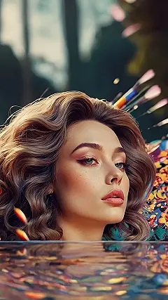 This picture looks like a cartoon wallpaper come to life! It’s like the girl is floating in a giant paint pot, with splashes of color all around her. Maybe she’s an artist who accidentally fell into her latest masterpiece, or perhaps she’s just taking a super-stylish bath in a world of vibrant colors. Whatever the story, it’s definitely a fun and creative scene that makes you want to dive right in!