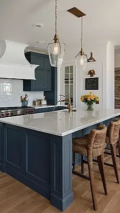 The navy blue cabinets are like a hug for your eyes, while the white countertops and wood floors bring a touch of warmth and coziness. The sleek pendant lights hanging above the island look like they came straight out of a magazine. This kitchen is proof that you don’t need a ton of stuff to have a beautiful space. Sometimes, less is definitely more!