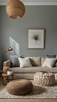 But wait, there’s more! Look at those awesome woven poufs – they’re like giant, comfy pebbles! And they’re not just pretty to look at; they’re practical too! Imagine chilling on the floor with your friends, surrounded by cozy texture and that incredible green wall – it’s the perfect spot for a movie marathon or a serious chat about your favorite pop stars. Plus, the rustic chandelier adds an unexpected touch of whimsy to the whole scene. It’s all about creating a space that feels cozy and stylish at the same time.