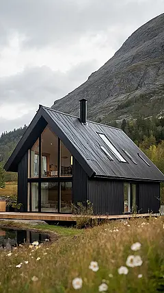 Imagine hiding away in this cool Scandinavian pad after a long day of surviving high school! The all-black exterior is like a secret lair, but with huge windows, so you can still keep an eye on who’s trying to steal your snacks from the fridge. It’s like Batman went to IKEA and decided to build a minimalist mountain retreat instead of a Batcave.