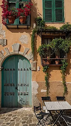 Imagine having a tiny piece of Italy right in your room! This image totally looks like it could be wallpaper. It’s got that cool, rustic vibe with the peeling paint and bright flowers, like something you’d see on a postcard. You could almost feel like you’re sitting at that little table, ready to slurp down some spaghetti – all without even leaving your desk!