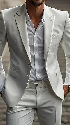 So, you want to rock a party and make everyone think you’re a VIP, huh? Well, check out this dude! He’s sporting an all-white suit, which is basically saying, “I’m fancy, but I’m also down to spill my drink on myself.” Just kidding! But seriously, this outfit screams confidence. Just remember, if you go for this look, maybe avoid the red punch or anything that could leave a stain. You don’t want to look like you lost a fight with a smoothie.