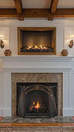 But then you look up, past the totally awesome mantle, and BAM! There’s another one! It’s like a fancy painting of a fire, framed in gold, sitting right there on the wall. This isn’t your grandma’s fireplace; it’s elevated style! You could practically have a staring contest with the flames while the downstairs fire does the heavy lifting for warmth. This living room definitely isn’t messing around when it comes to doubling down on the whole “warm and inviting” thing.
