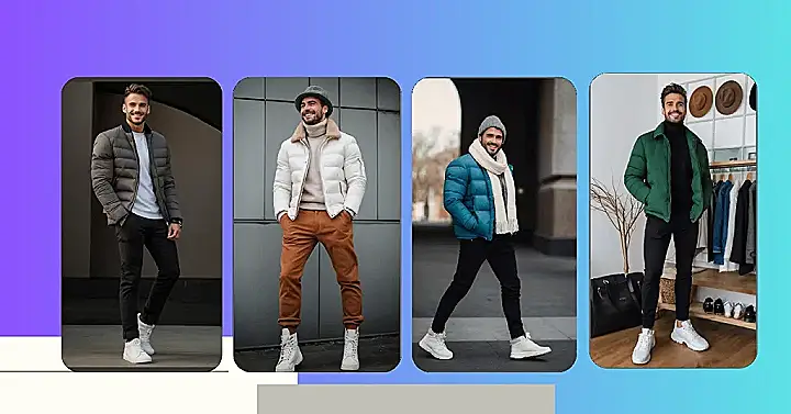Hey there, fashion fans! Check out this awesome winter outfit. Forget freezing your buns off – this dude’s got the perfect blend of cozy and cool. That taupe puffer jacket is serious business; it’s like a warm hug you can wear. Pair that with some sharp black trousers and crisp white sneakers, and you’ve got yourself a streetwear look that’s ready to conquer even the iciest sidewalks. Think of it as a stylish survival kit for those chilly winter days.