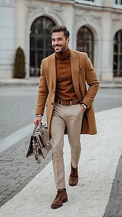 Hey there, fashion-forward friend! Check out this dude – he’s totally nailed the “winter outfits men streetwear” look. Forget those bulky, grandpa-style winter coats; this guy’s rocking a stylish camel coat that’s super chic and way more comfortable. It’s like he’s saying, “I’m warm, I’m stylish, and I’m ready to conquer the snow – one stylish step at a time!” Plus, that turtleneck and those awesome brown shoes? Perfection! He’s proving that staying warm doesn’t mean you have to sacrifice your awesome streetwear game.