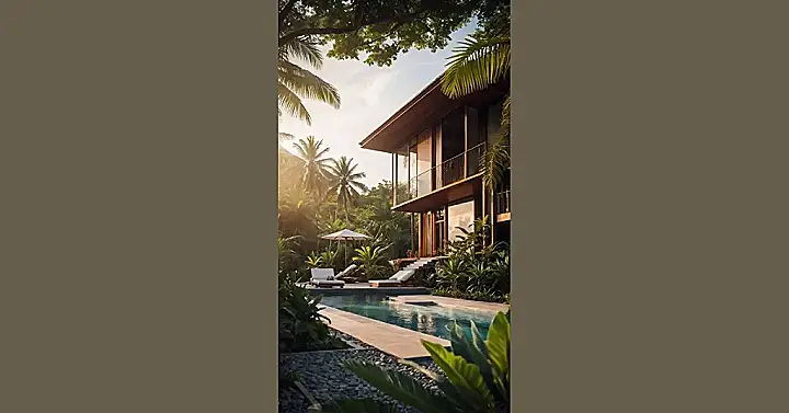 This isn’t your average house; it’s a full-on modern tropical house party happening right here! Look at it, all sleek lines and warm wood chilling out amongst a gazillion plants. It’s like it decided regular houses were boring and decided to crash land in paradise. And that pool? It’s basically sending out invites saying, “Come on in, the water’s probably awesome, and definitely better than anything happening outside this picture.”