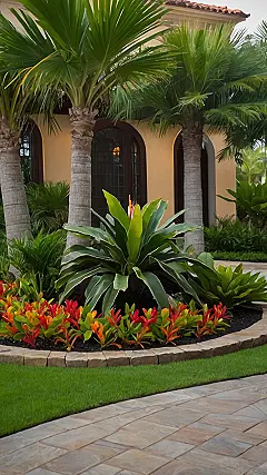 Imagine you’re walking through a secret garden, the kind you see in movies with giant leaves and flowers that look like they came straight out of a jungle. This picture shows a tropical landscape design that’s so cool, it makes you want to grab your swimsuit and head for the beach.