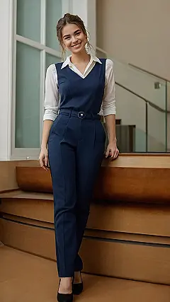 This woman is rocking a classic look with her navy blue trousers and a white shirt. They’re the kind of trousers that say “I’m here to work hard and look good doing it.” And who doesn’t love a little bit of confidence with their outfit? She’s got the perfect mix of smart and stylish, like she’s about to ace a presentation or head out for a night on the town.