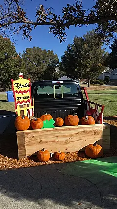 This truck bed is ready to party! It’s decked out with candy canes (so many candy canes!) and even a few festive leaves for good measure. Just imagine all the little ghosts and goblins who will be thrilled to get a treat from this spooky sweet setup. Maybe you could add a spooky banner, some cobwebs, or even a friendly monster to really give your truck bed a Halloween vibe!