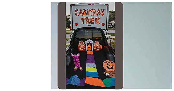 This truck bed is ready for some serious trick-or-treating fun! It looks like they’ve transformed their truck into a spooky wonderland, with colorful decorations, pumpkins galore, and a mysterious little creature in the pink striped pajamas. It’s like the truck bed is straight out of a Halloween movie! They’ve even got a little white archway, which looks like a portal to some spooky shenanigans. The kids will be so excited to check out all the decorations and grab some treats from this awesome truck!