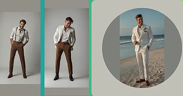 Picking the perfect summer wedding outfit for guys is all about looking good while fighting the heat like a ninja. Forget dark colors that act like sun magnets; light colors like white, like our beach model, or light blue are your friends because they help bounce that sunshine away. It’s a real challenge trying to look dapper and sophisticated without sweating through your shirt in the first ten minutes. Finding clothes made from materials that let you breathe is key – you want to look ready for a wedding, not like you just ran a marathon in a sauna suit. It’s a balancing act between style points and not completely overheating.