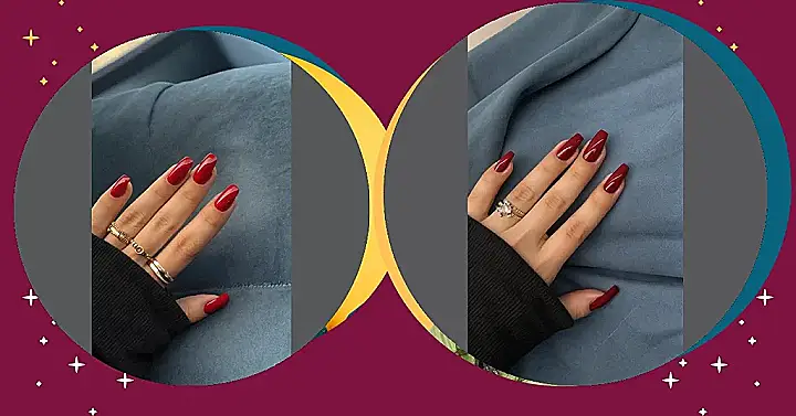 These nails are the perfect shade of “dark wine red,” like a vampire’s favorite juice box! They’re so shiny and sleek, they look like they could be used to slice through a tomato (don’t actually try that though, unless you want a really messy manicure!). The length is just right, not too long to poke anyone’s eyes out, but long enough to be seriously stylish. Plus, those rings really add some extra pizzazz!