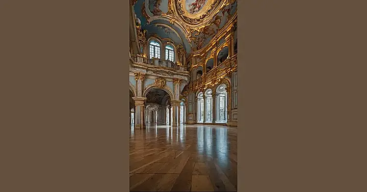 This picture shows off the grandeur of Baroque architecture. Just imagine walking up those fancy stairs, feeling like a king or queen. They’re probably made of marble, so they’re extra slippery if you’re wearing fancy shoes, but hey, at least they’re extra shiny! The walls are covered in gold leaf, which is probably worth more than your whole house, and there’s so much detail everywhere – like those fancy chandeliers, it’s like someone took a bunch of fancy swirls and stuck them on the walls! It’s definitely the kind of place where people would wear their best clothes and have parties that lasted all night.
