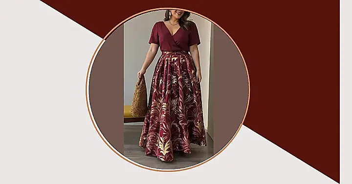 This outfit is like a magical mix of comfy and fancy! It’s got this cool maroon top that’s simple but chic, with a V-neck that shows just enough skin to be sassy. And then there’s the skirt, oh my goodness, it’s like a swirling dream with its leafy pattern and flowy shape. You could totally picture yourself twirling around in this, maybe in a fancy garden party or a super fun dance. It’s all about being confident and comfortable in your own skin, and this outfit definitely has that vibe.