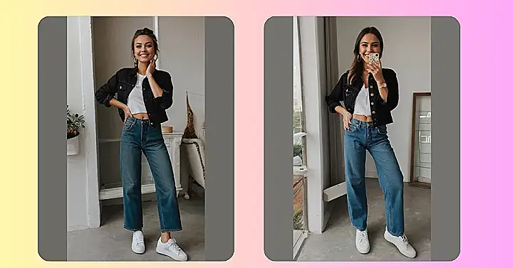This outfit is seriously cool! It’s like, the perfect blend of comfy and stylish. Those mom jeans are totally rocking the casual vibe, and paired with a simple black top, they’re giving off major effortless chic. Who knew something so comfortable could look so good? It’s like the ultimate “I woke up like this” look, but way more put-together. Throw in some white sneakers and a denim jacket, and you’re ready to conquer the world – or at least, that Friday afternoon hangout!