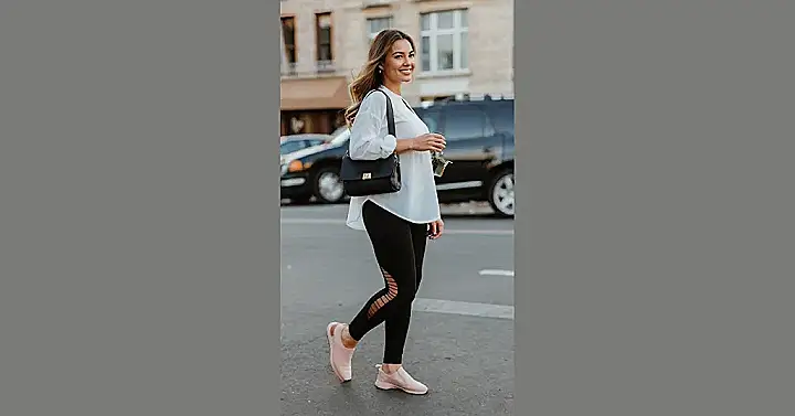 Those aren’t just any leggings; they’re *spring* leggings! And what better way to rock them than with a comfy white shirt and some cute sneakers? It’s like saying, “I’m stylish but also ready to chase after that ice cream truck,” all in one outfit. Plus, the cut-outs in the leggings? Total game changer. It’s like your legs are wearing tiny windows to let the spring breeze in!