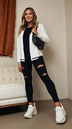 Those leggings are seriously next level. They’re not just plain black leggings, they’ve got these cool little cutouts that are like peek-a-boo windows for your knees. Plus, the whole black and white thing is super classic, so you can totally mix and match this outfit with stuff you already have in your closet. It’s basically the perfect outfit to transition from studying to hanging out without having to change your whole look.