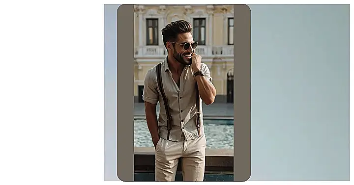 This guy’s totally rocking the casual look! He’s like a modern-day James Bond, but instead of saving the world, he’s saving the day with his effortlessly cool outfit. That light beige shirt and matching pants? Pure perfection. And those suspenders? Don’t even get me started – they’re adding a touch of sophisticated flair that’s totally unexpected. It’s the kind of outfit you can wear to a picnic in the park or a casual date, proving that sometimes, less is definitely more. He’s mastered the art of “dressed up, but not trying too hard” – and that, my friends, is a serious skill.