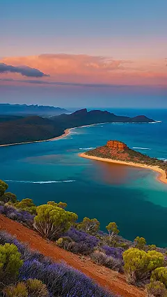 This photo is like a postcard from another planet—but it’s actually Australia! Imagine waking up to this view: the sun painting the sky in shades of orange and pink, while the turquoise water hugs the coastline. It’s seriously gorgeous; even a kangaroo would stop and take a selfie! Those little purple bushes look like they’re posing for the camera too. It’s the perfect example of Australia’s amazing aesthetic, capturing that unique blend of vibrant colours and wild landscapes. Makes you want to pack a bag and go explore, right?