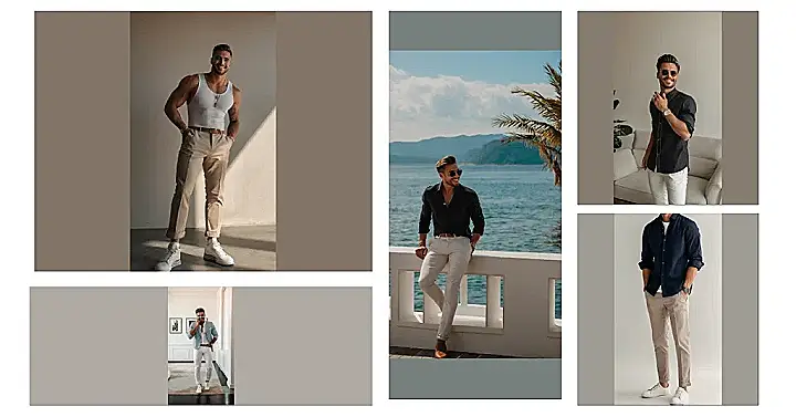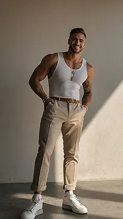 Want to look like you just stepped out of a magazine but also ready to chill with your friends? This look is perfect! White tank top, comfy chinos, and fresh white sneakers are a total win. It’s like saying, “Yeah, I look good, but I’m also down to play video games and eat pizza.” Plus, a few chains and bracelets never hurt to show off your personal style.