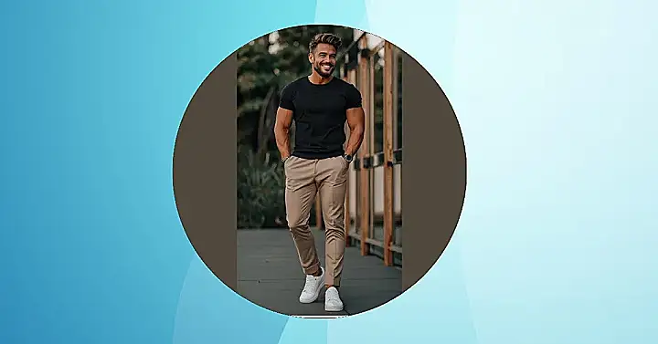 This guy’s outfit is like the ultimate chill vibe meets a touch of sophistication. A simple black t-shirt and khaki pants create a look that’s both comfy and polished. And let’s not forget those clean white sneakers! They’re like the perfect finishing touch to say, “I’m cool, I’m confident, and I’m ready for anything.” Forget about wearing a stuffy suit to impress, this guy knows that sometimes, less is truly more.