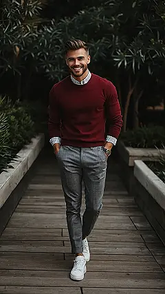 This guy is rocking a classic look with a comfy sweater. He’s like, “I’m cool and casual, but I still want to look sharp.” The red sweater is a bold choice that pops against his grey pants. It’s like he’s saying, “I’m not afraid to be different, and I’m totally confident in my style.” And let’s not forget those crisp white sneakers! They’re the perfect finishing touch for this relaxed yet stylish look. It’s the kind of outfit that makes you feel good whether you’re hanging out with friends or grabbing coffee with your mom.