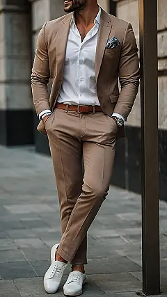 So, you want to look like you just stepped off a Vespa in Rome? This guy’s got the look down! The tan suit is like a cappuccino – smooth and classy. He’s rocking the unbuttoned shirt like he’s about to break into a spontaneous Italian song. Just imagine him dramatically tossing a coin in a fountain; that’s the vibe we’re going for.