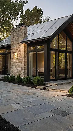 And just look at those windows! It’s like they’re showing off a nature documentary inside. They’re so big, you could probably spot a squirrel from your armchair (if you had one, of course). The dark framing really makes the glass pop, and adds a touch of modern coolness to the otherwise super cozy stone and wood design. You wouldn’t believe how tranquil this house probably feels, especially at sunset!