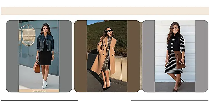 The image shows a lady rocking a totally cute outfit that would be perfect for transitioning from summer to fall! It’s a little bit classic, a little bit edgy, and definitely perfect for those midsize ladies who want to feel confident and stylish. She’s got on a classic black dress that looks super comfy, but then she’s amped it up with a denim jacket and white boots. It’s like she’s saying, “I’m all about that casual chic look, and I’m not afraid to mix and match!”