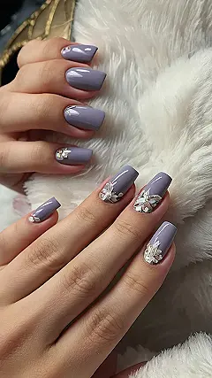 These violet nails aren’t just pretty; they’re like tiny works of art! Imagine each nail as a little canvas, carefully painted a gorgeous shade of purple, and then adorned with delicate, sparkly flowers. It’s like someone took a whole bunch of tiny, shimmering snowflakes and glued them onto your nails – super fancy, yet totally awesome! They’re the perfect blend of sophisticated and playful, ideal for a school dance or even just hanging out with friends.