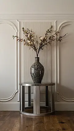 That’s one seriously stylish vase! It’s like the vase decided to throw a party, and invited all the most sophisticated-looking faux flowers to come and hang out. Seriously, that dark patterned vase against the creamy, fancy wall is like wall decor goals. It’s the perfect blend of elegance and a touch of “oh so chic!” I bet the vase is whispering secrets to the flowers about all the cool wall art it’s seen.